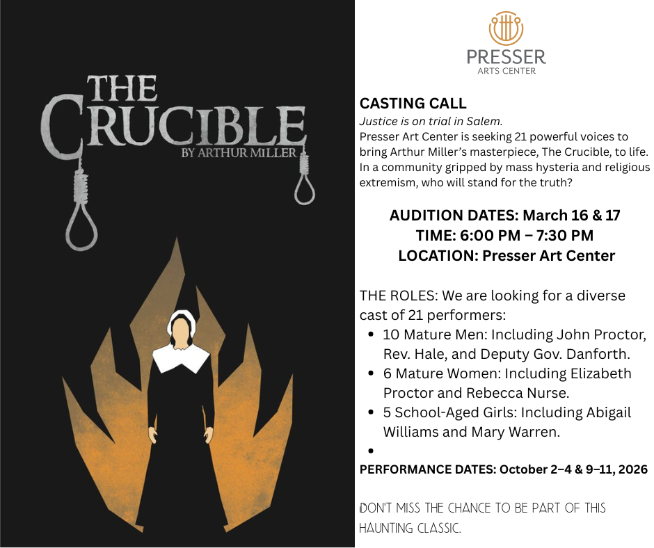PRESSER ART CENTER IS HOLDING AUDITIONS FOR ARTHUR MILLER’S THE CRUCIBLE, A CLASSIC DRAMA EXPLORING MASS HYSTERIA AND RELIGIOUS EXTREMISM DURING THE 1692 SALEM WITCH TRIALS.